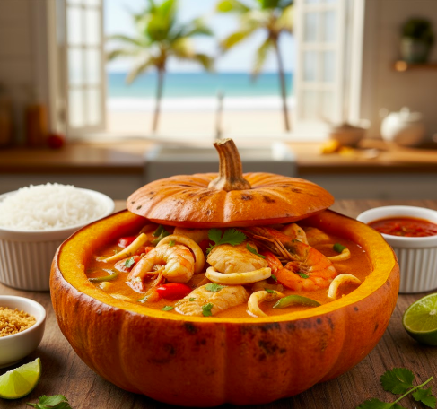 Otro plato digno de mención es el camarão na moranga, originario del litoral paulista. Consiste en una calabaza rellena de camarones en una crema de leche de coco y requesón. Su aspecto —una calabaza entera servida en la mesa— lo convierte en una experiencia visual y gustativa. Hoy se prepara en distintas regiones costeras, adaptándose a los productos locales, como el dendê en Bahía o las ostras en Santa Catarina.
