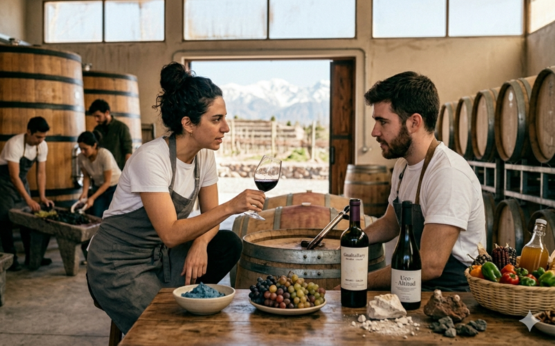 El efecto de la altitud: En el Valle de Uco, los viñedos suben hasta los 1,600 metros. A mayor altura, mayor radiación solar y noches más frías, lo que produce uvas con pieles gruesas y una acidez vibrante.