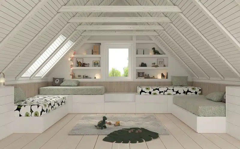 En el antiguo desván de una casa de campo, se ha realizado totalmente a medida el mobiliario de lo que ahora es una gran habitación infantil