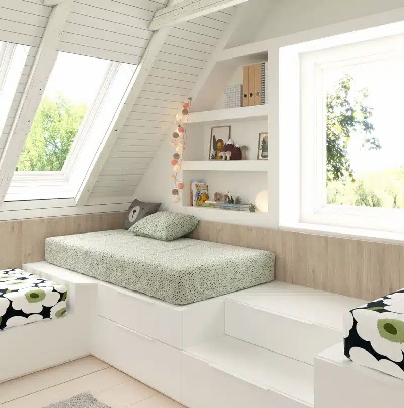 En la parte frontal, las dos camas quedan más elevadas, aprovechando esta mayor altura para ubicar cajones de almacenaje. En la parte del centro, se ha ubicado una escalera que también esconde cajones en su interior. Las camas laterales son tipo nido y aguardan dos camas individuales más, en total en esta habitación pueden dormir hasta 6 personas. Las estanterías también ha realizado totalmente a medida así como dos cómodas, también en blanco.