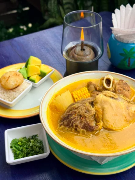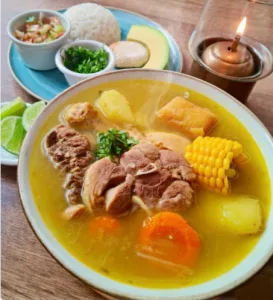 Sopa típica Antioqueña Colombiana de tres carnes (res, pollo y cerdo)