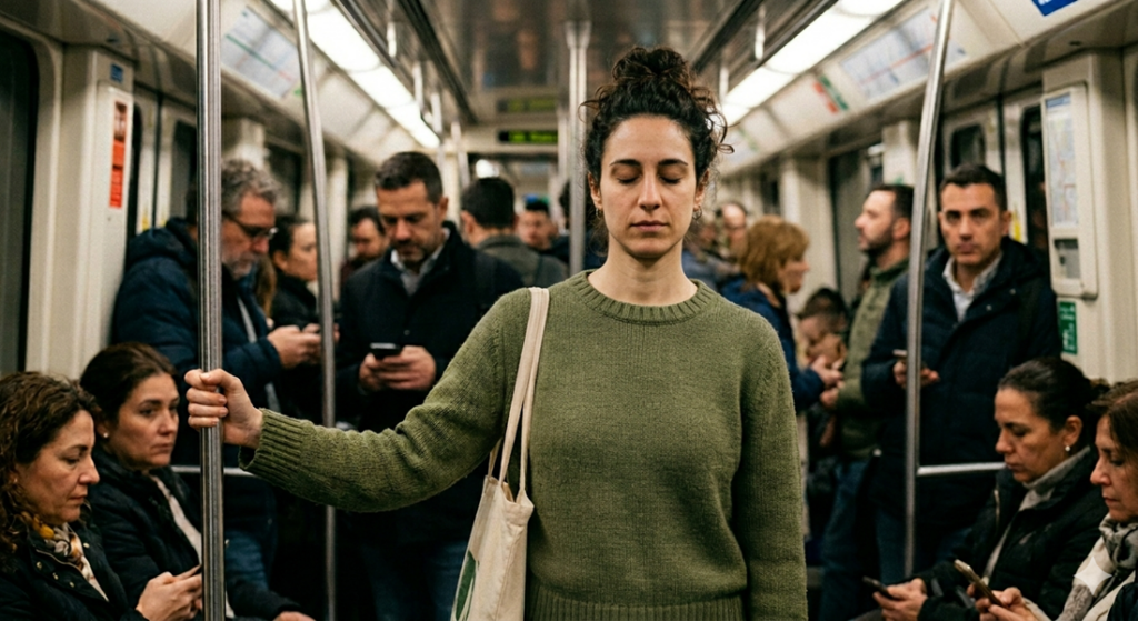 El Anclaje. Encuentra tu centro antes de subir. El caos suele empezar antes de que llegue el bus o el tren. La ansiedad de «¿lograré entrar?» o «¿llegaré tarde?» activa nuestro sistema de alerta. La técnica del escaneo rápido. Mientras esperas en el andén o la parada, no saques el móvil inmediatamente. Siente el peso de tus pies sobre el concreto. Nota la temperatura del aire. Visualización de límites. Imagina una burbuja protectora a tu alrededor. No es para aislarte con desprecio, sino para establecer que el caos exterior no tiene permiso para entrar en tu estado de ánimo.